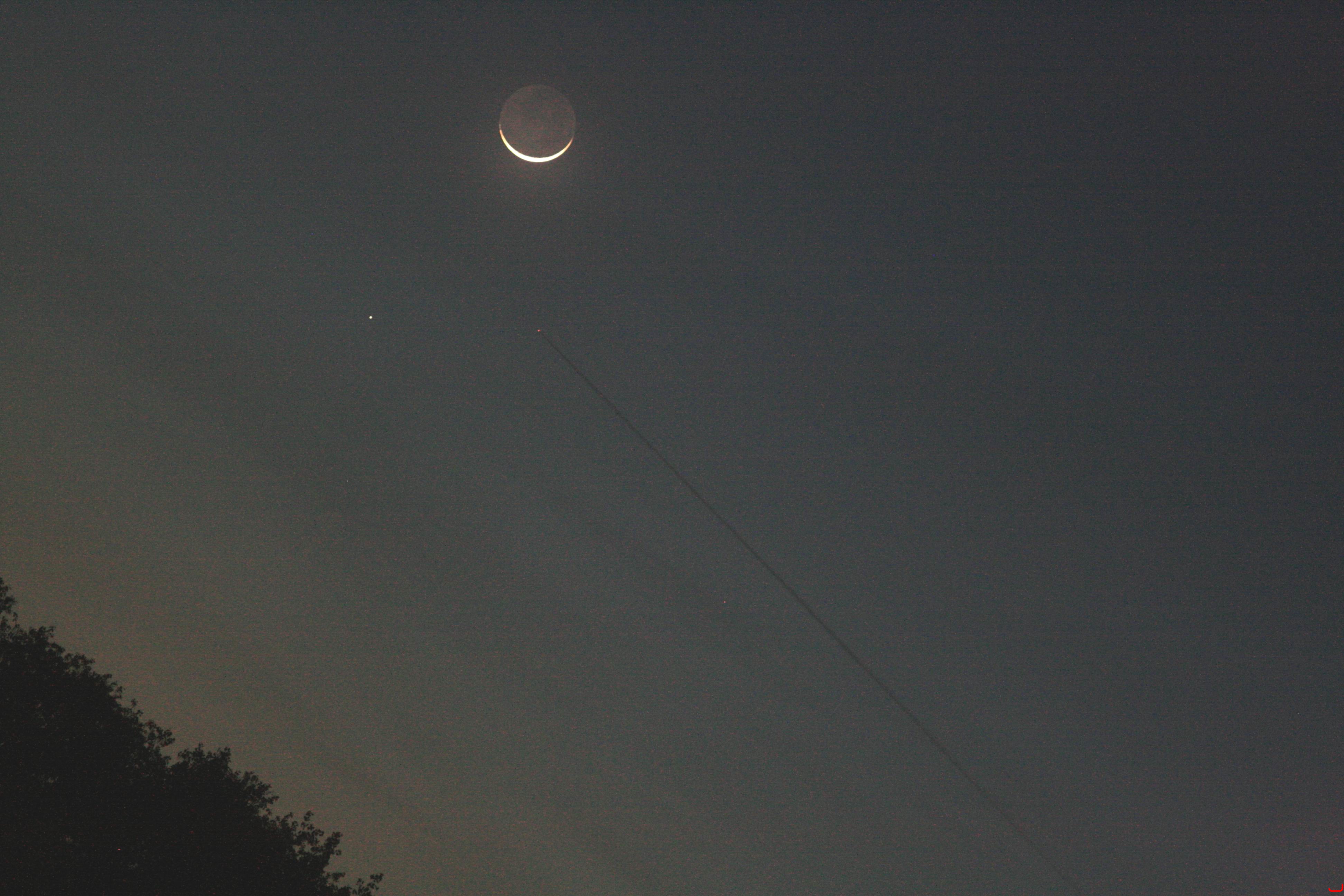 Mond und Merkur,Balkonsternwarte, 26. 4. 2009,Sonnar 3,5/135 mit EOS 400D auf EQ6,ISO 1600, 1/4 s.Der Mond war zum Aufnahmezeitpunkt 37 Stunden alt.
